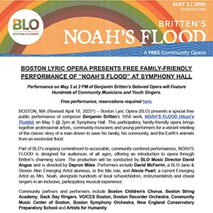Noah’s Flood is made possible by BLO supporters who are invested in building the next generation of opera lovers in Boston. Join BLO in its first community opera uniting Boston through music, collaboration, and fun — a perfect outing for the whole family!